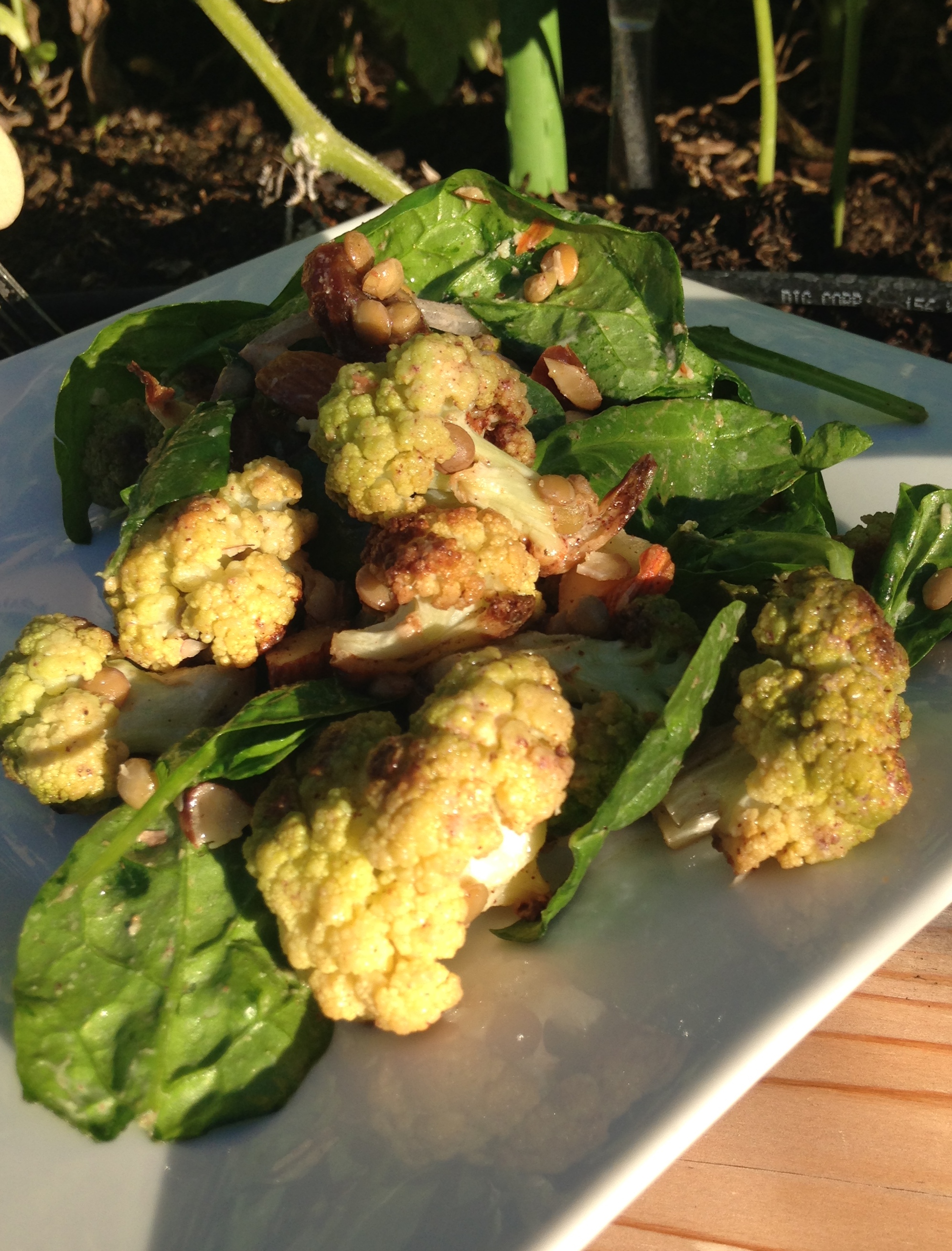 - In a large bowl, whisk the tahini with the lemon juice, honey, remaining 1 Tbsp. olive oil and water. Add lentils and season with salt and pepper. Toss to coat. Add roasted cauliflower, almonds, dates, onion, and spinach. Toss and enjoy.